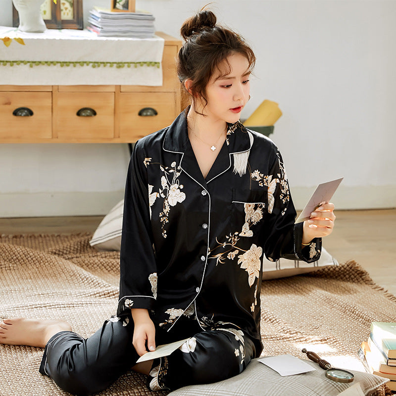 Ice Silk Couple Pajamas Spring And Summer Long-sleeved Printed Silk Pajamas